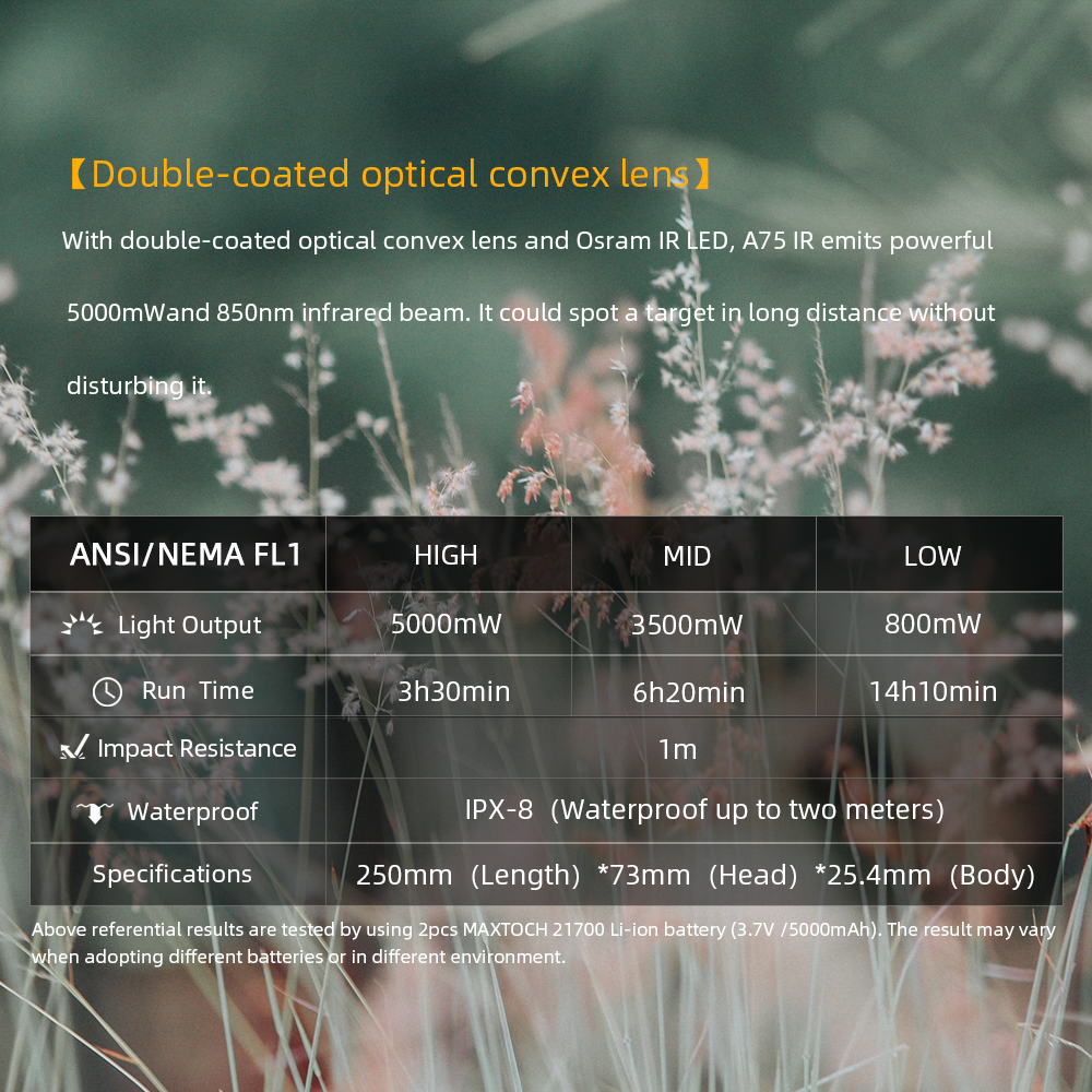 LED - Osram infrared LED Max Output - 5000mWReflector - convex lens Wavelength - 850nmBattery - 2 × 21700 Max Runtime - 3h30minSize - 250mm × 73mm × 25.4mm Weight - 412g